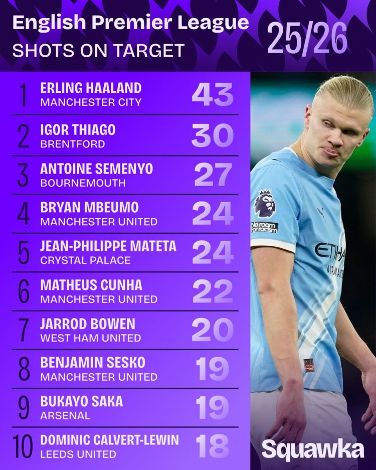 实时比分-本赛季英超射正榜:哈兰德居首,塞梅尼奥、萨卡+曼联三叉戟在列