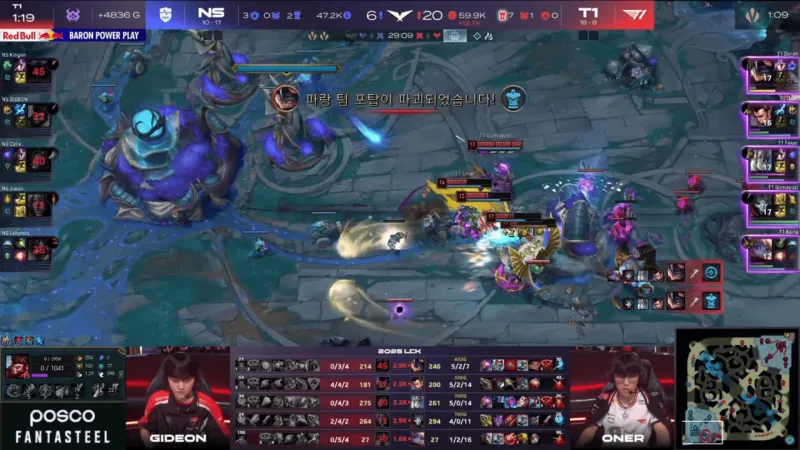 比赛第25分钟,两队在下路爆发团战,NS牛头发条打出小配合顶起三人,但T1轻松打出1换5团灭NS。